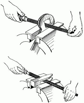 В ходе опиливания деталь периодически освобождают из тисков и поворачивают относительно ее оси на небольшой угол (приблизительно на 1/5 оборота). Качество работы проверяют с помощью шаблона.